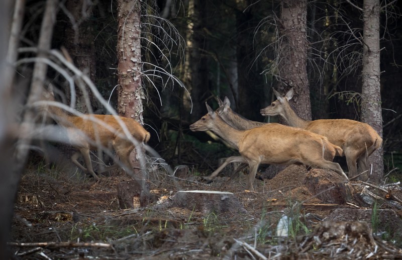 A group of hinds (the female deer) in a dark spruce forest. Photo: Niels Lisborg.